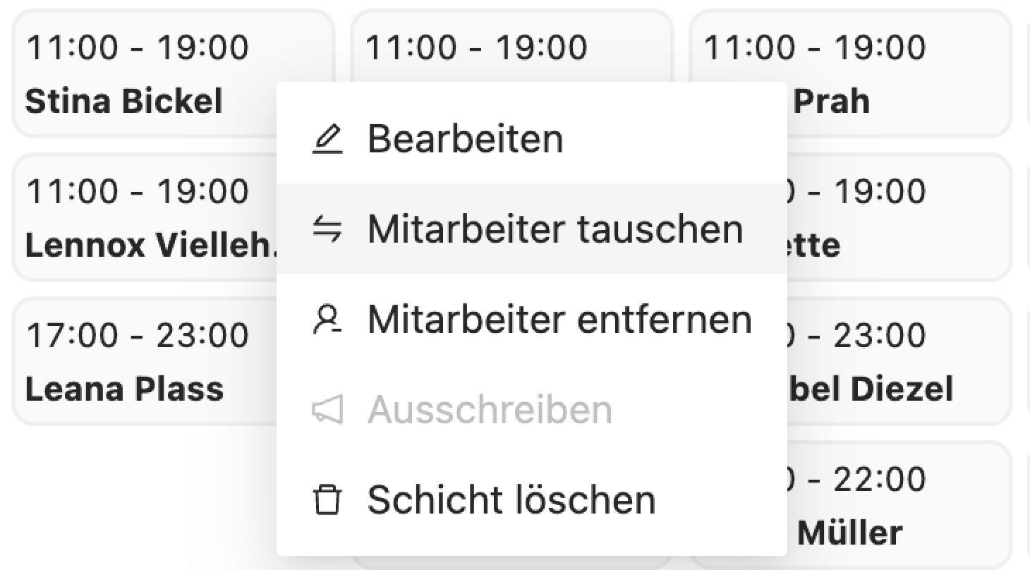 Um 2 Personen miteinander zu tauschen, klicke mit Rechtsklick auf die erste Person. Es wird ein Tausch-Symbol erscheinen. Mit diesem kannst du auf die zweite Person klicken und die Schichten werden automatisch getauscht.