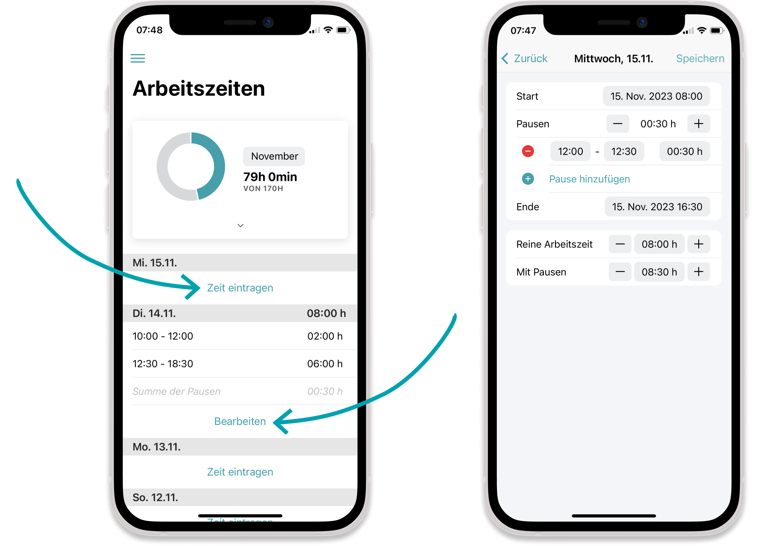 Das selbständige Eintragen und Ändern der erfassten Arbeitszeiten, steht nur dann zur Verfügung, wenn dein Arbeitgeber die Funktion freigeschaltet hat.