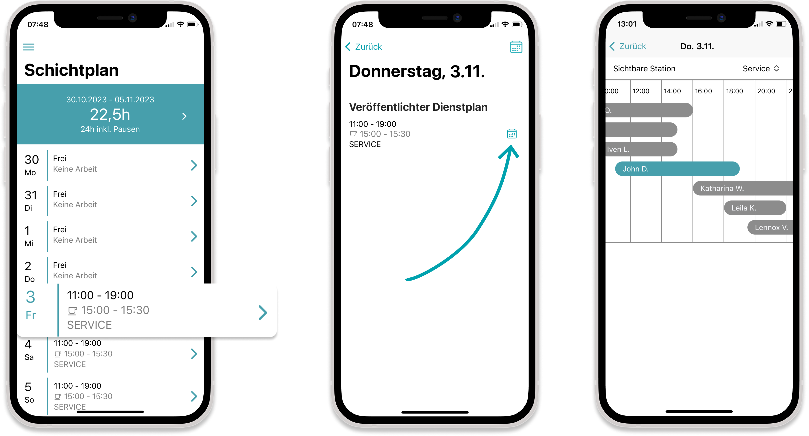 Im Schichtplan in der Mitarbeiter-App werden ausgeschriebene Schichten in türkis gekennzeichnet. Mit zwei Klicks kann sich ein Mitarbeiter hierfür bewerben.