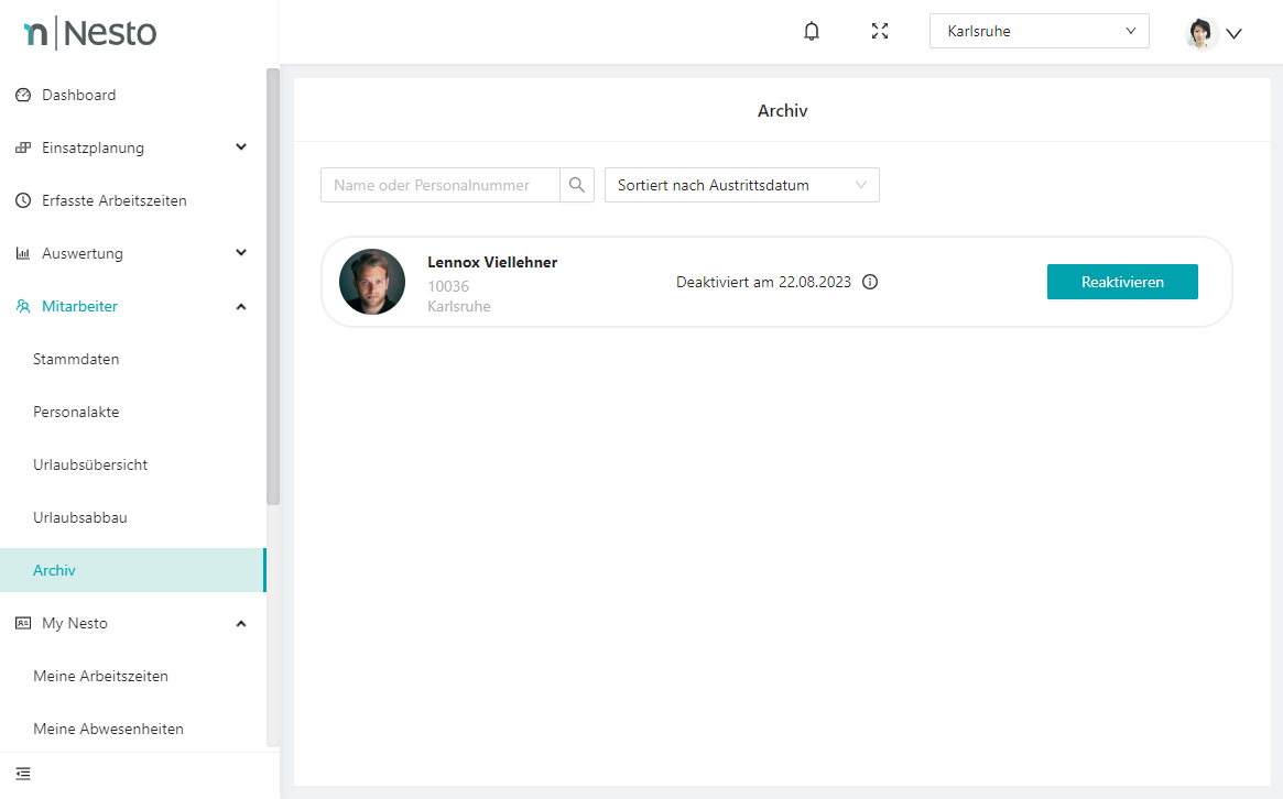 Grundsätzlich wird in Nesto ein:e Mitarbeiter:in zunächst deaktiviert, bevor er/sie automatisch endgültig gelöscht wird. Optional ist eine dauerhafte Archivierung buchbar. In diesem Fall, werden die Daten entsprechend der gesetzlichen Aufbewahrungsfristen archiviert. Je nach Art der Daten und hinterlegten Löschfristen, sind dies meist 3-10 Jahre. Innerhalb dieser Zeit kann ein:e Mitarbeiter:in auch wieder über den Menüpunkt Archiv reaktiviert werden.