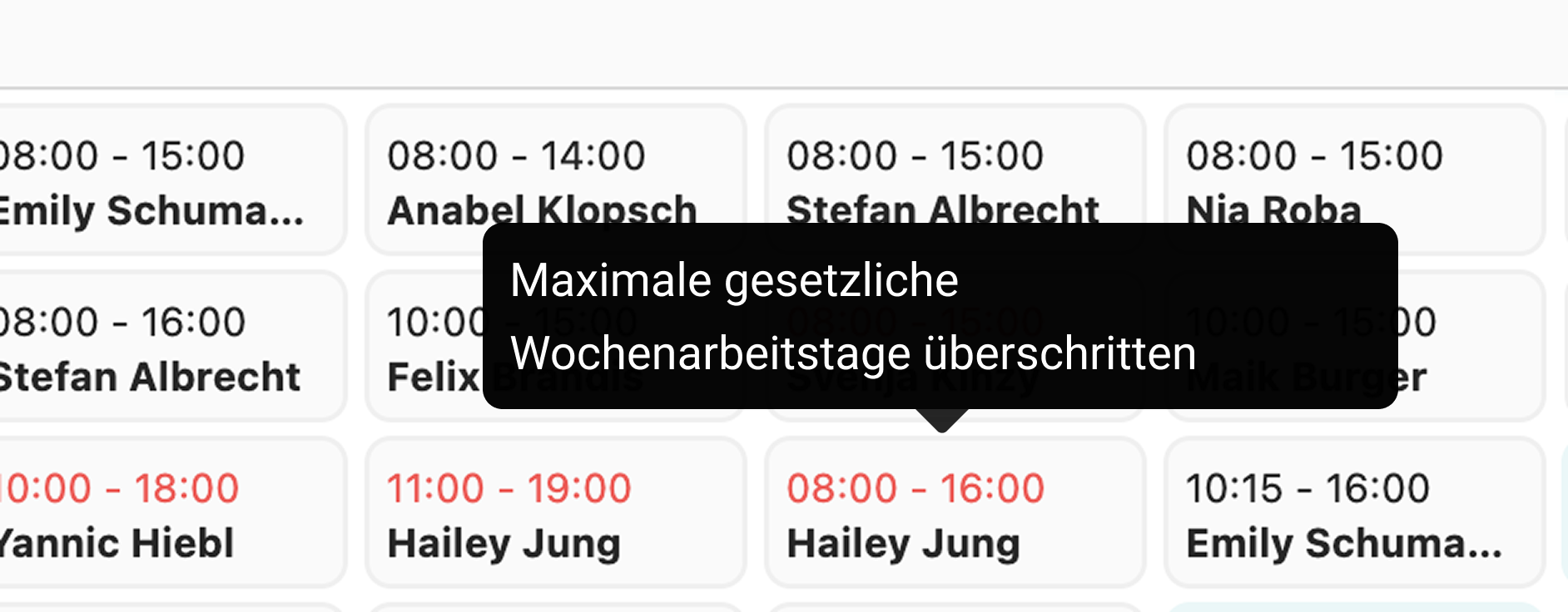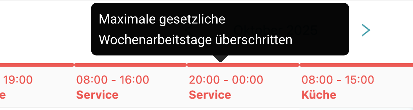Eine neue Regel prüft zusätzlich, ob das gesetzlich zulässige Limit von sechs Wochenarbeitstagen überschritten wird. Verstöße gegen das gesetzliche Maximum werden rot dargestellt – für maximale Rechtssicherheit in Ihrer Einsatzplanung.